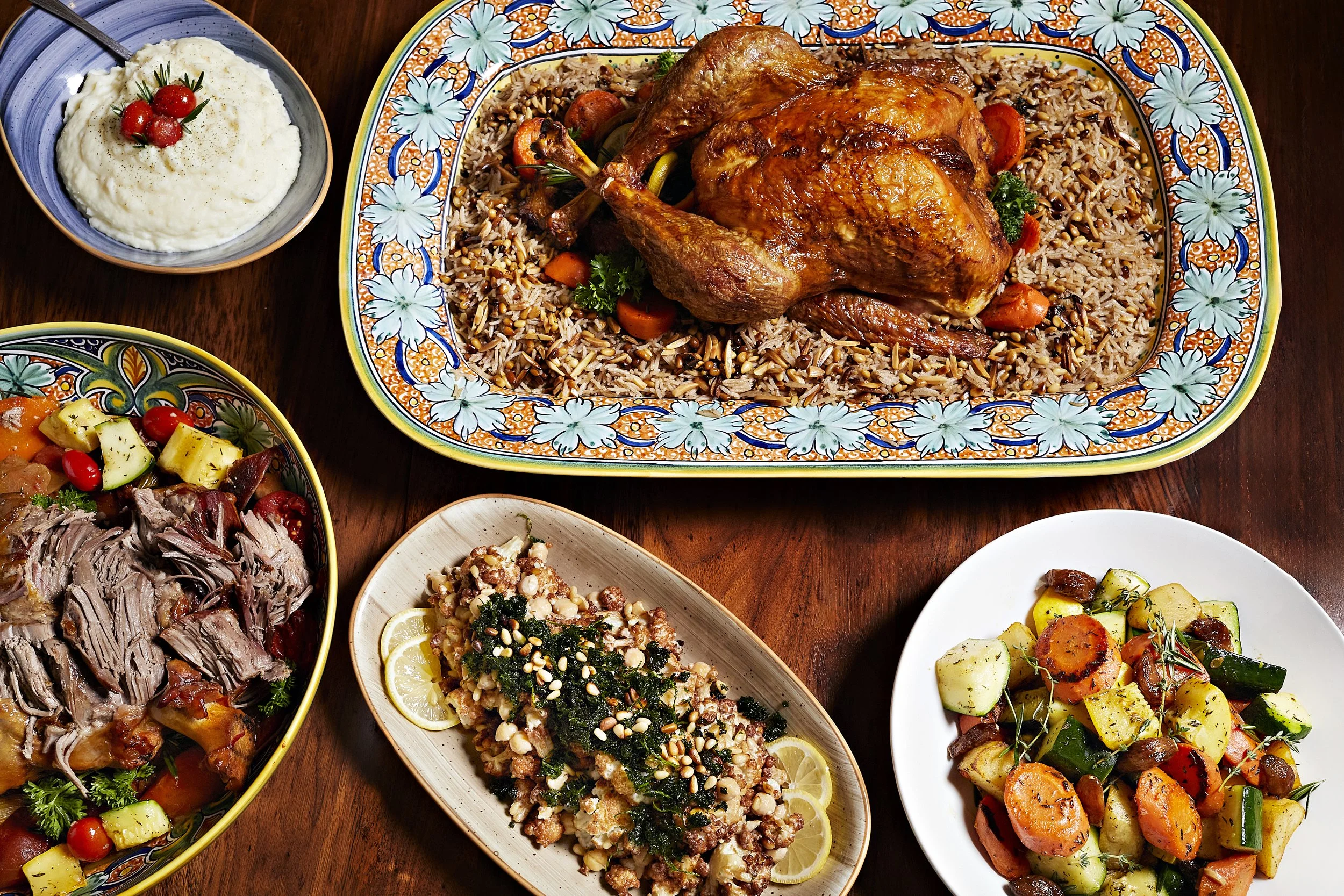 Lebanese style turkey on spiced rice, roasted vegetables, fried cauliflower, leg of lamb