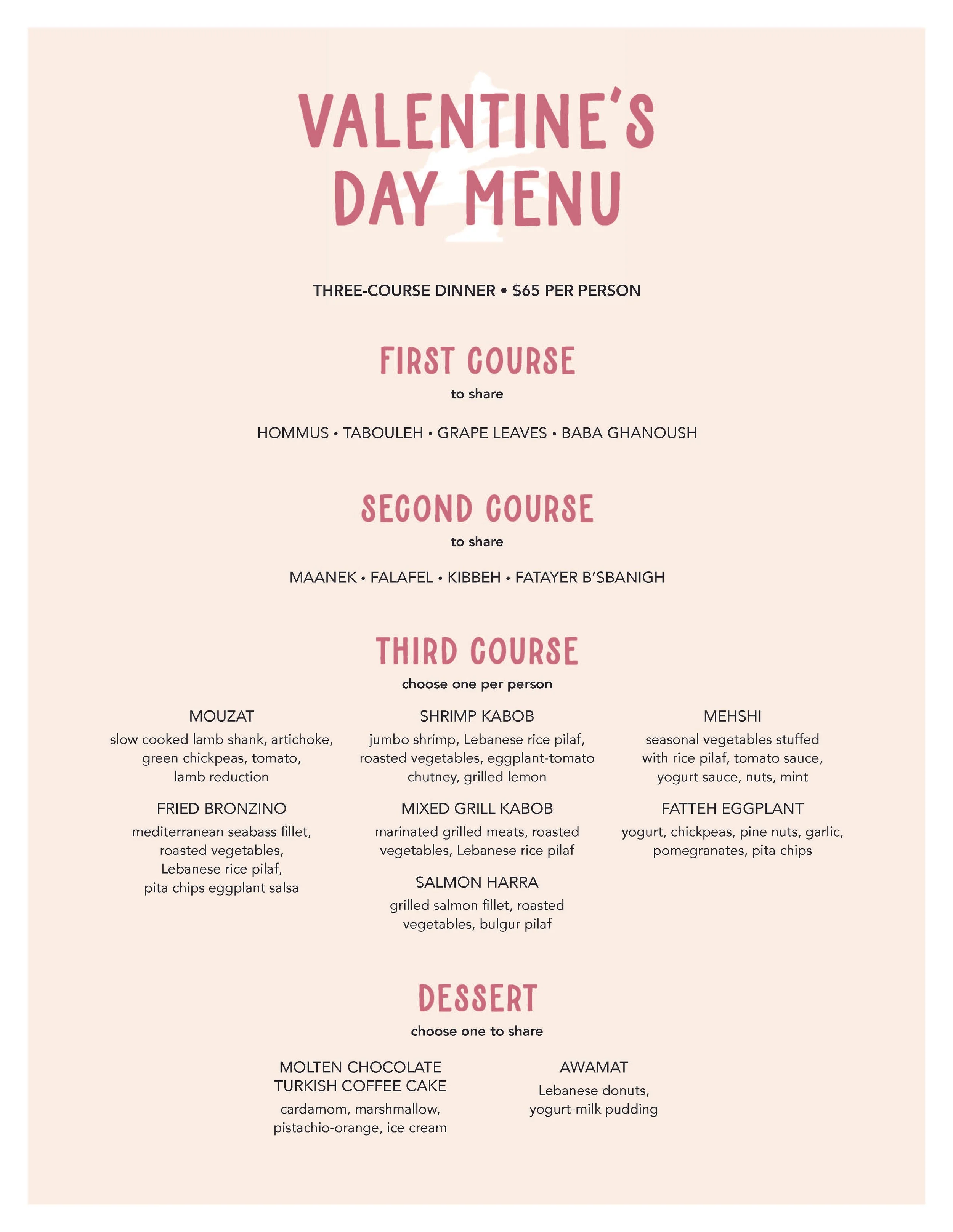 This year, treat that special someone to a romantic three-course dinner for two featuring a seductive selection of mezza favorites and sharable entrees. Wine pairings and dessert special supplementals will be also be available.